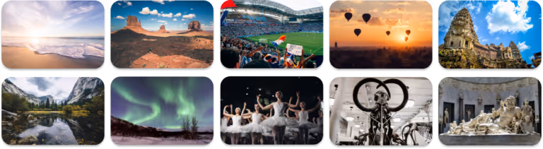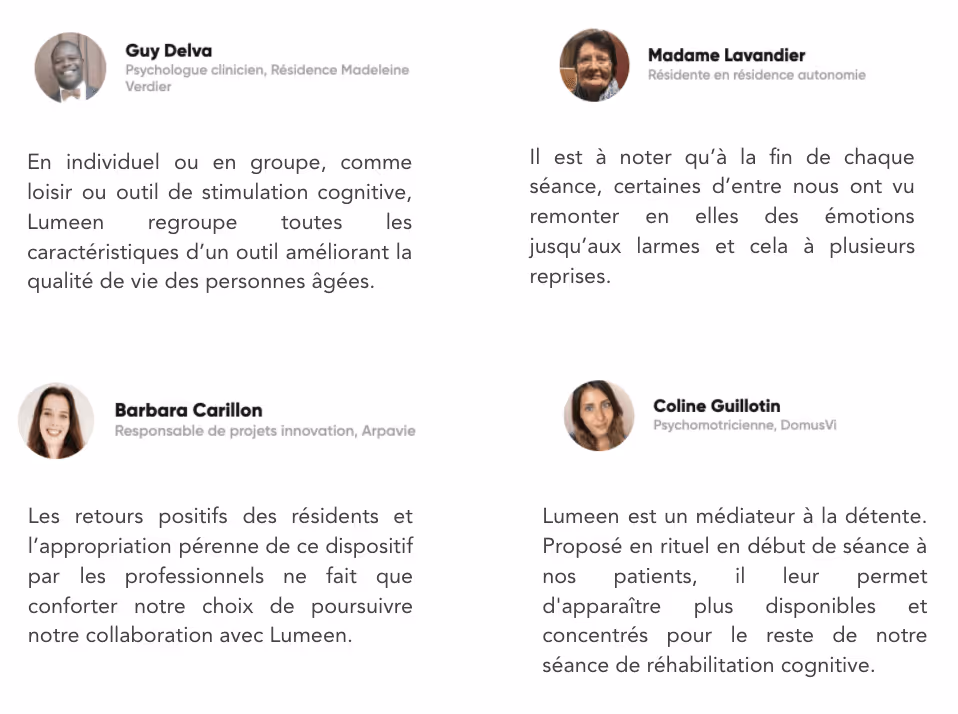 Our experiences are designed for seniors. We offer a large library of immersive videos on the themes of travel, nature and culture. With Lumeen, you can be transported in front of a turquoise sea or to the top of a snowy mountain; swim with dolphins or come face to face with a Canadian elk; marvel at the aurora borealis in Alaska or discover Thailand and its customs or discover Thailand and its customs; visit a cattle farm or a large Parisian museum. We want to cover everyone's desires for discovery and nostalgia. To do this, we work with creators around the world to always offer new experiences. All our experiences are accompanied by soft and relaxing music.
