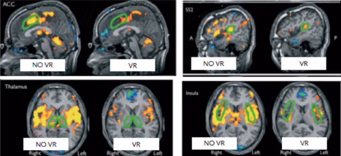 In recent years, the use of virtual reality has become more widespread in the hospital sector, as headsets have proven to be particularly effective tools to act as a distractor to divert attention from pain. A neuroimaging study has also shown a reduction in the brain activity of regions involved in the perception of pain during virtual reality sessions (Figure 1) [3].