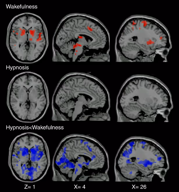 The authors of a 2009 study explored the differences in brain activation induced by painful and non-painful stimulations in healthy subjects under hypnosis and in a normal state of wakefulness [4]. While pain stimulations in a state of wakefulness predictably activated the regions involved in pain perception, these same stimulations, under hypnosis, did not cause significant activation of these regions (Figure 2). The last line in Figure 2 is a comparison of activation patterns between the normal arousal state and the hypnotic state. Regions activated during painful stimulation (in blue in the figure) are significantly less active under hypnosis only in a normal state of wakefulness. These results suggest that hypnosis could significantly modulate the brain processes involved in pain perception.